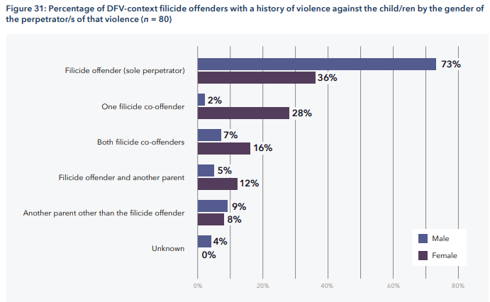 DO “Emphasise the strong connection between a history of domestic and family violence, especially intimate partner violence and filicide. Most of the time, the killing of a child by their parent is not a “one-off incident” but part of a history of behaviour.” However, the history of abuse of the child is true for both female and male perpetrators. It is both intuitively and statistically correct to say that the vast majority of filicide offenders are themselves victims - whether that be of substance abuse, poverty, or past trauma.